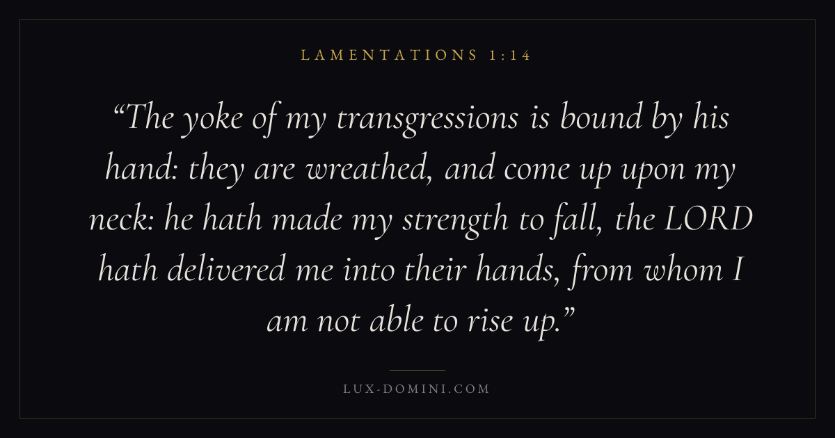 The yoke of my transgressions is bound by his hand: they are wreathed, and come up upon my neck: he hath made my strength to fall, the LORD hath delivered me into their hands, from whom I am not able to rise up.