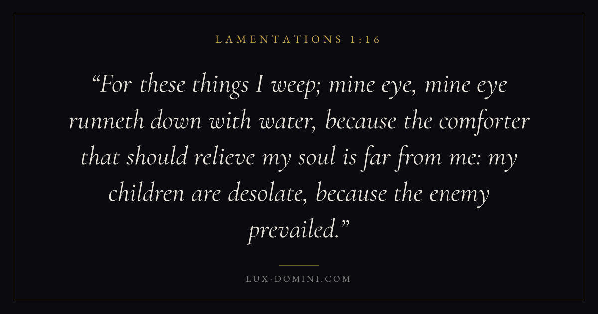 For these things I weep; mine eye, mine eye runneth down with water, because the comforter that should relieve my soul is far from me: my children are desolate, because the enemy prevailed.