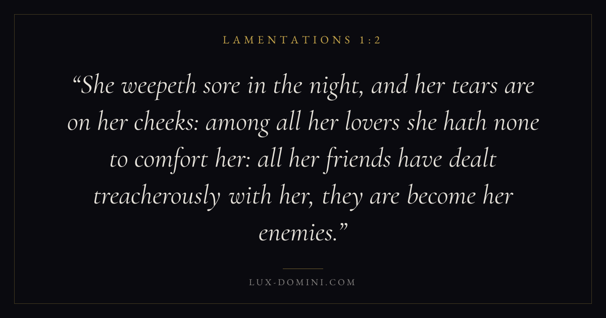 She weepeth sore in the night, and her tears are on her cheeks: among all her lovers she hath none to comfort her: all her friends have dealt treacherously with her, they are become her enemies.