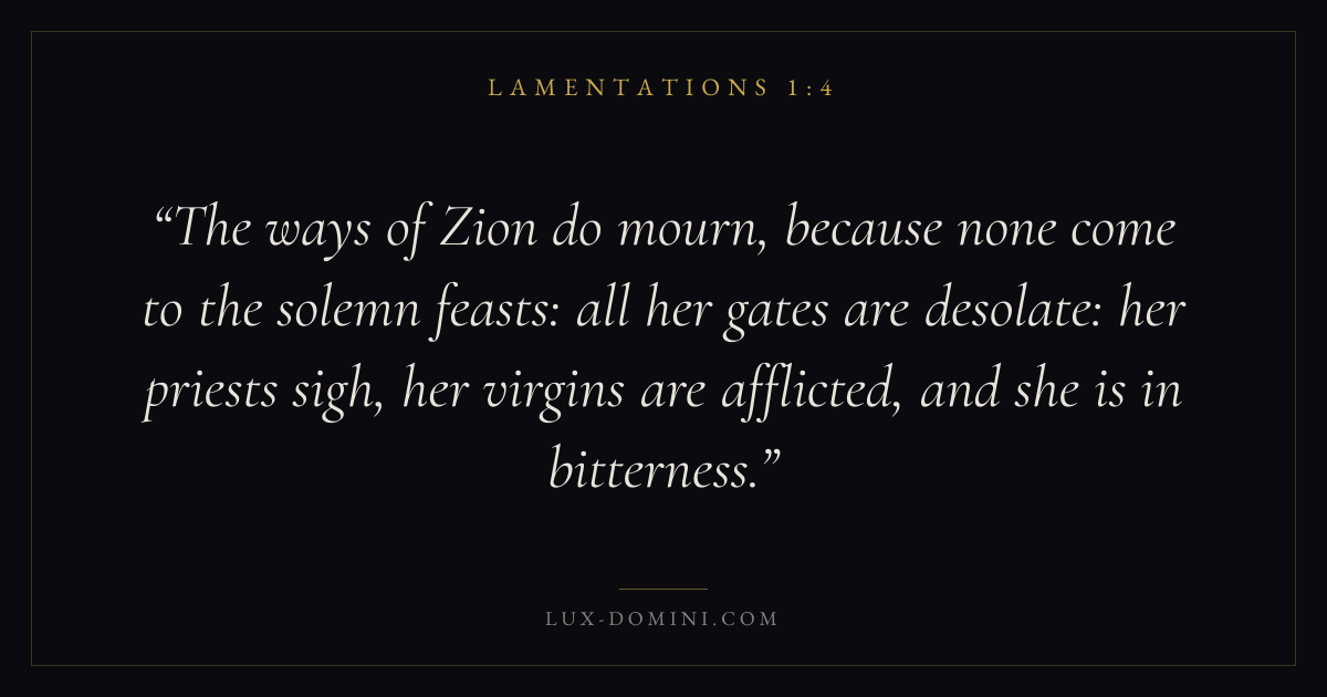 The ways of Zion do mourn, because none come to the solemn feasts: all her gates are desolate: her priests sigh, her virgins are afflicted, and she is in bitterness.