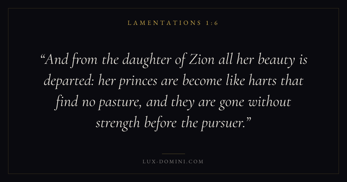 And from the daughter of Zion all her beauty is departed: her princes are become like harts that find no pasture, and they are gone without strength before the pursuer.