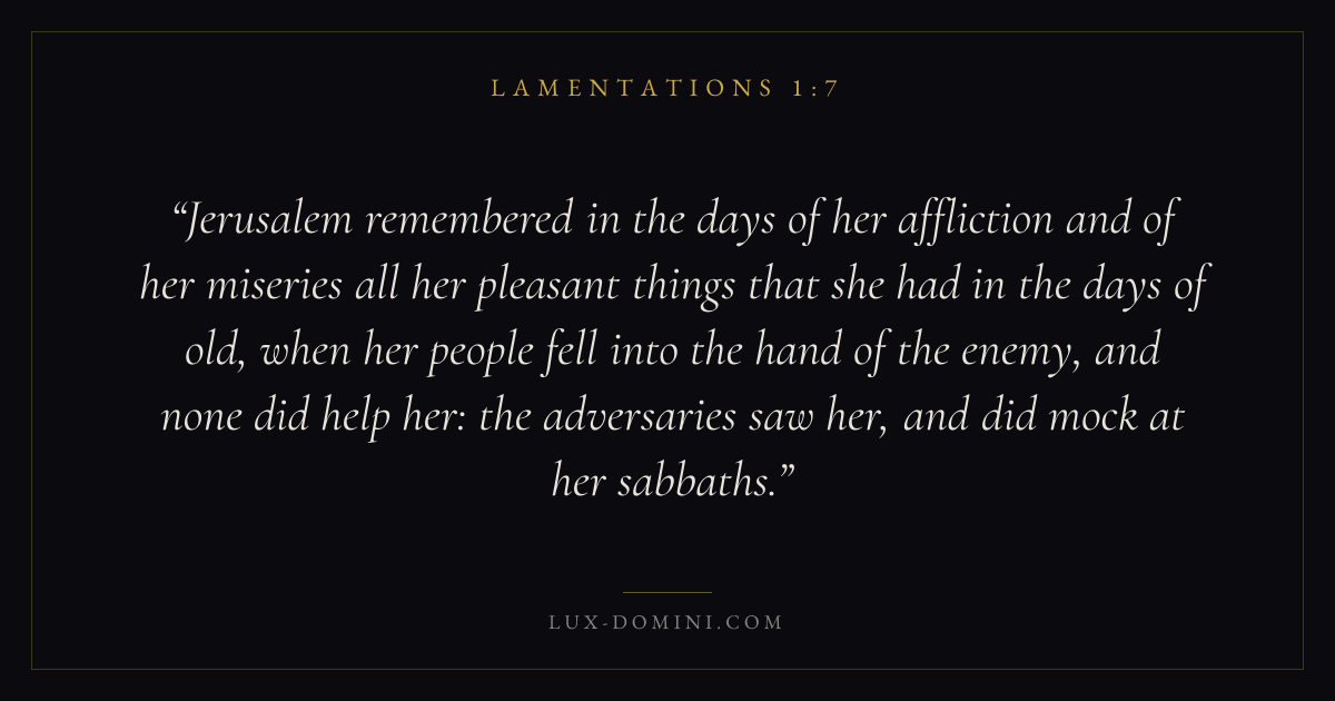 Jerusalem remembered in the days of her affliction and of her miseries all her pleasant things that she had in the days of old, when her people fell into the hand of the enemy, and none did help her: the adversaries saw her, and did mock at her sabbaths.
