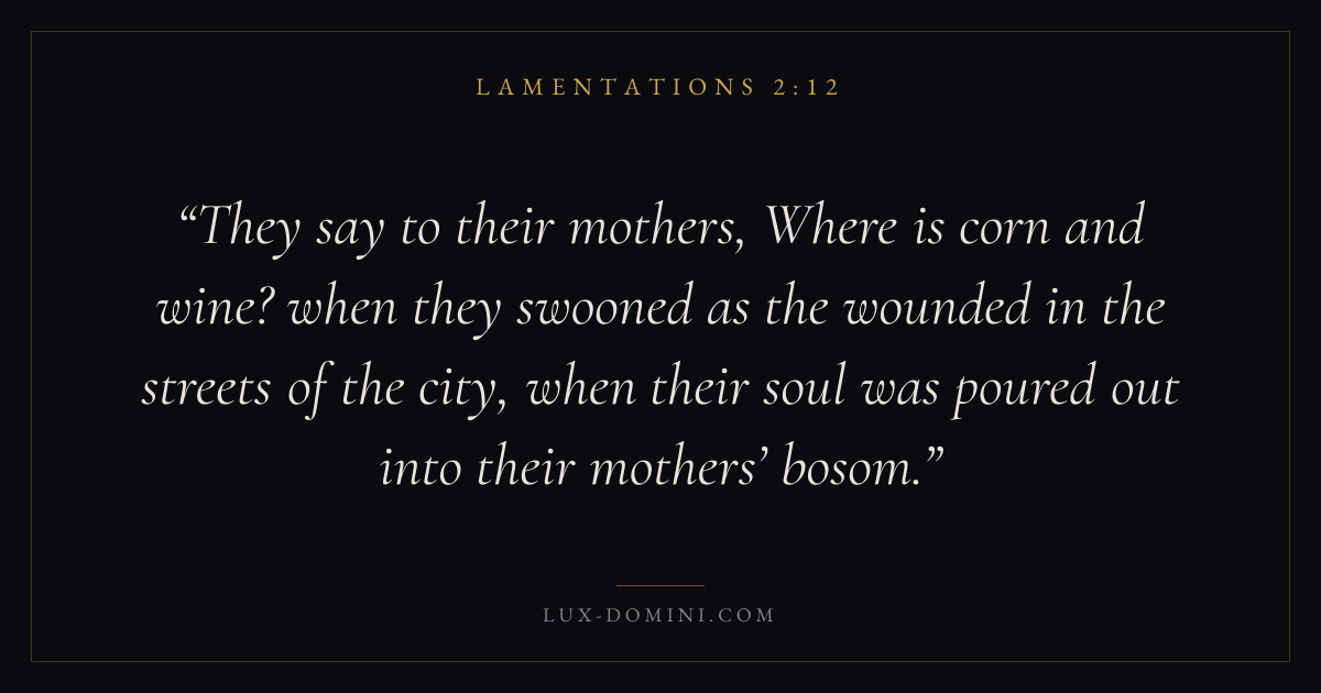 They say to their mothers, Where is corn and wine? when they swooned as the wounded in the streets of the city, when their soul was poured out into their mothers’ bosom.