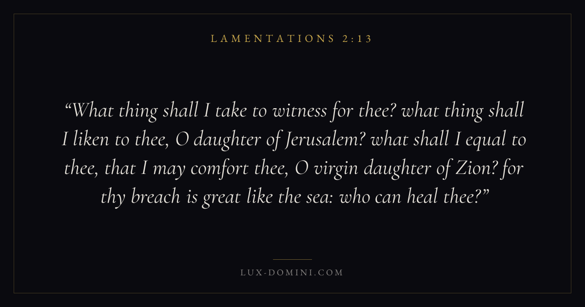 What thing shall I take to witness for thee? what thing shall I liken to thee, O daughter of Jerusalem? what shall I equal to thee, that I may comfort thee, O virgin daughter of Zion? for thy breach is great like the sea: who can heal thee?