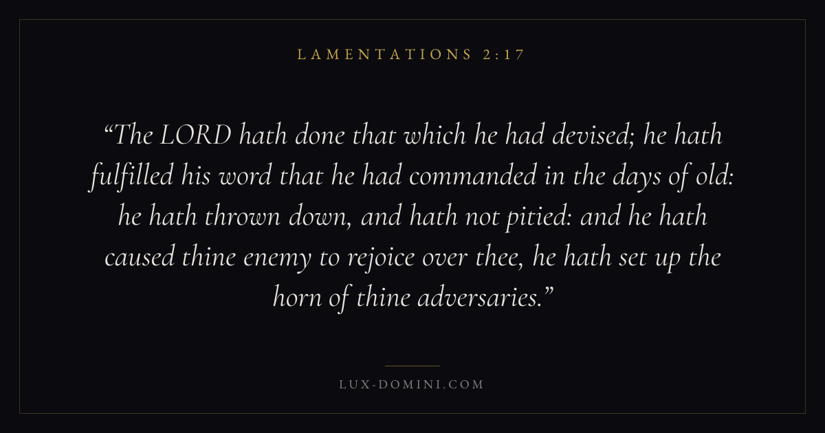The LORD hath done that which he had devised; he hath fulfilled his word that he had commanded in the days of old: he hath thrown down, and hath not pitied: and he hath caused thine enemy to rejoice over thee, he hath set up the horn of thine adversaries.