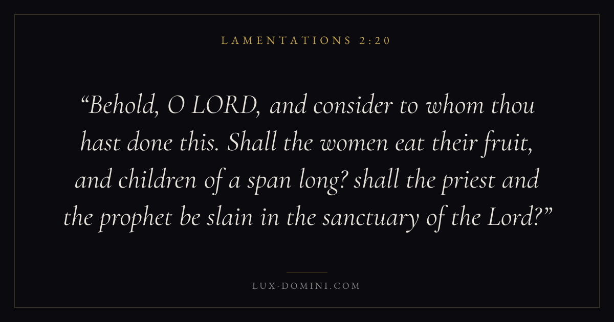 Behold, O LORD, and consider to whom thou hast done this. Shall the women eat their fruit, and children of a span long? shall the priest and the prophet be slain in the sanctuary of the Lord?