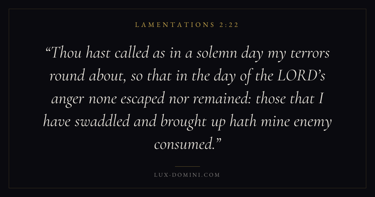 Thou hast called as in a solemn day my terrors round about, so that in the day of the LORD’s anger none escaped nor remained: those that I have swaddled and brought up hath mine enemy consumed.