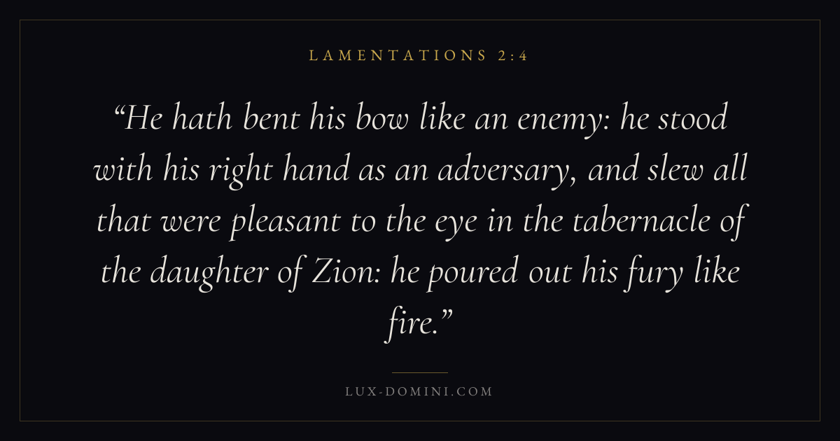 He hath bent his bow like an enemy: he stood with his right hand as an adversary, and slew all that were pleasant to the eye in the tabernacle of the daughter of Zion: he poured out his fury like fire.