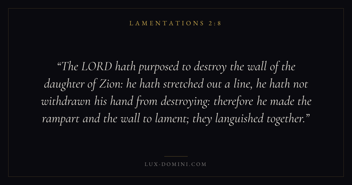 The LORD hath purposed to destroy the wall of the daughter of Zion: he hath stretched out a line, he hath not withdrawn his hand from destroying: therefore he made the rampart and the wall to lament; they languished together.