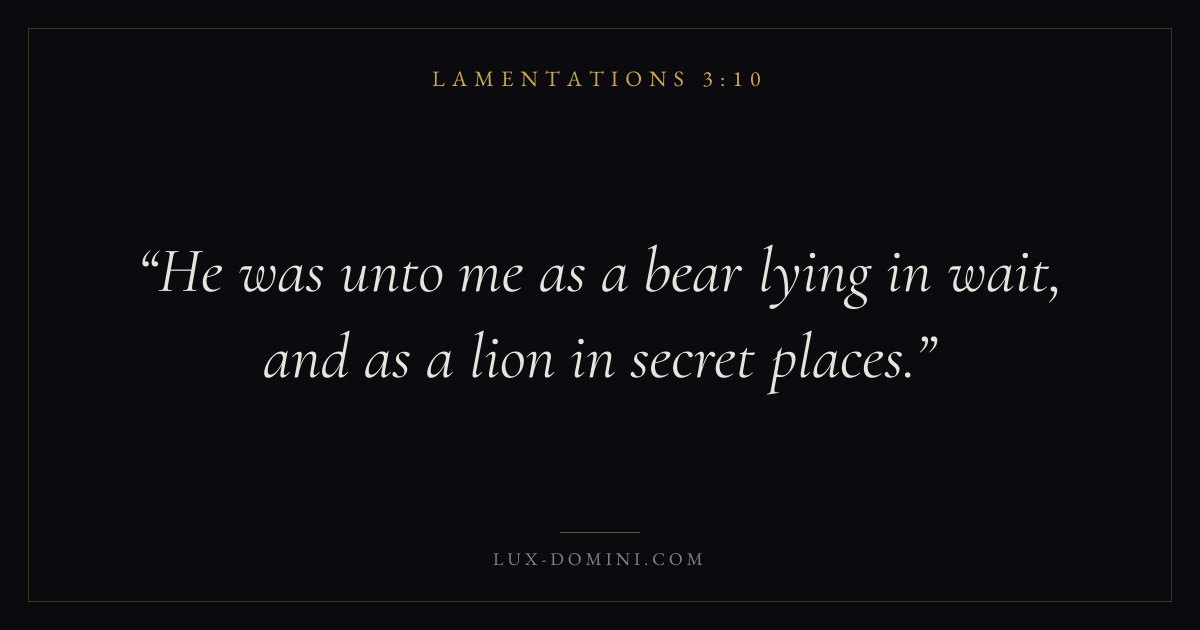 Books / Lamentations / Chapter 3 / Verse 10 ← Lamentations 3:9 Lamentations 3:10 Lamentations 3:11 → He was unto me as a bear lying in wait, and as a lion in secret places. Download verse card Share on Twitter Share on Facebook Pin it ✦ Key themes HopeSuffering and trialsJustice and mercyLament Read with Lamentations 3:9Romans 8:24Revelation 21:4Romans 8:18 Related topics Bible verses about hopeBible verses about suffering and trialsBible verses about justice and mercyBible verses about grief and loss ✦ Lamentations Chapter 3 verses V. 1 V. 2 V. 3 V. 4 V. 5 V. 6 V. 7 V. 8 V. 9 V. 10 V. 11 V. 12 V. 13 V. 14 V. 15 V. 16 V. 17 V. 18 V. 19 V. 20 V. 21 V. 22 V. 23 V. 24 V. 25 V. 26 V. 27 V. 28 V. 29 V. 30 V. 31 V. 32 V. 33 V. 34 V. 35 V. 36 V. 37 V. 38 V. 39 V. 40 V. 41 V. 42 V. 43 V. 44 V. 45 V. 46 V. 47 V. 48 V. 49 V. 50 V. 51 V. 52 V. 53 V. 54 V. 55 V. 56 V. 57 V. 58 V. 59 V. 60 V. 61 V. 62 V. 63 V. 64 V. 65 V. 66