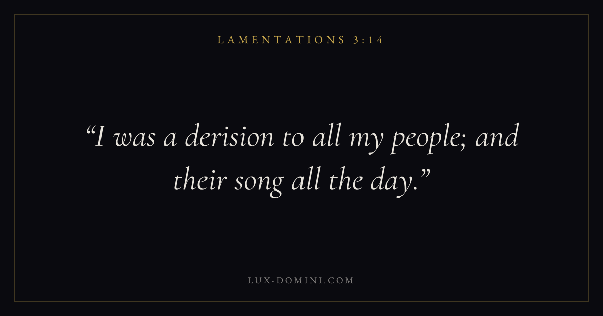 Books / Lamentations / Chapter 3 / Verse 14 ← Lamentations 3:13 Lamentations 3:14 Lamentations 3:15 → I was a derision to all my people; and their song all the day. Download verse card Share on Twitter Share on Facebook Pin it ✦ Key themes HopeSuffering and trialsJustice and mercyLament Read with Lamentations 3:13Lamentations 3:15Romans 8:24Revelation 21:4 Related topics Bible verses about hopeBible verses about suffering and trialsBible verses about justice and mercyBible verses about grief and loss ✦ Lamentations Chapter 3 verses V. 1 V. 2 V. 3 V. 4 V. 5 V. 6 V. 7 V. 8 V. 9 V. 10 V. 11 V. 12 V. 13 V. 14 V. 15 V. 16 V. 17 V. 18 V. 19 V. 20 V. 21 V. 22 V. 23 V. 24 V. 25 V. 26 V. 27 V. 28 V. 29 V. 30 V. 31 V. 32 V. 33 V. 34 V. 35 V. 36 V. 37 V. 38 V. 39 V. 40 V. 41 V. 42 V. 43 V. 44 V. 45 V. 46 V. 47 V. 48 V. 49 V. 50 V. 51 V. 52 V. 53 V. 54 V. 55 V. 56 V. 57 V. 58 V. 59 V. 60 V. 61 V. 62 V. 63 V. 64 V. 65 V. 66