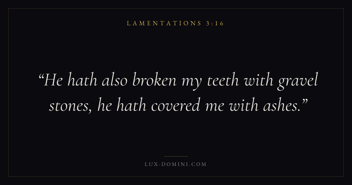 Books / Lamentations / Chapter 3 / Verse 16 ← Lamentations 3:15 Lamentations 3:16 Lamentations 3:17 → He hath also broken my teeth with gravel stones, he hath covered me with ashes. Download verse card Share on Twitter Share on Facebook Pin it ✦ Key themes HopeSuffering and trialsJustice and mercyLament Read with Lamentations 3:17Lamentations 3:18Romans 8:24Revelation 21:4 Related topics Bible verses about hopeBible verses about suffering and trialsBible verses about justice and mercyBible verses about grief and loss ✦ Lamentations Chapter 3 verses V. 1 V. 2 V. 3 V. 4 V. 5 V. 6 V. 7 V. 8 V. 9 V. 10 V. 11 V. 12 V. 13 V. 14 V. 15 V. 16 V. 17 V. 18 V. 19 V. 20 V. 21 V. 22 V. 23 V. 24 V. 25 V. 26 V. 27 V. 28 V. 29 V. 30 V. 31 V. 32 V. 33 V. 34 V. 35 V. 36 V. 37 V. 38 V. 39 V. 40 V. 41 V. 42 V. 43 V. 44 V. 45 V. 46 V. 47 V. 48 V. 49 V. 50 V. 51 V. 52 V. 53 V. 54 V. 55 V. 56 V. 57 V. 58 V. 59 V. 60 V. 61 V. 62 V. 63 V. 64 V. 65 V. 66