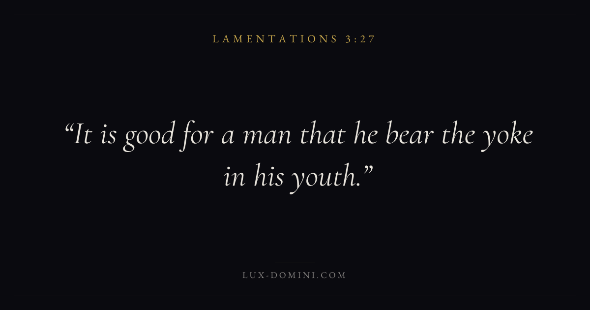 Books / Lamentations / Chapter 3 / Verse 27 ← Lamentations 3:26 Lamentations 3:27 Lamentations 3:28 → It is good for a man that he bear the yoke in his youth. Download verse card Share on Twitter Share on Facebook Pin it ✦ Key themes HopeJustice and mercyLamentJudgment Read with Lamentations 3:26Romans 8:24Revelation 21:4Micah 6:8 Related topics Bible verses about hopeBible verses about justice and mercyBible verses about grief and loss ✦ Lamentations Chapter 3 verses V. 1 V. 2 V. 3 V. 4 V. 5 V. 6 V. 7 V. 8 V. 9 V. 10 V. 11 V. 12 V. 13 V. 14 V. 15 V. 16 V. 17 V. 18 V. 19 V. 20 V. 21 V. 22 V. 23 V. 24 V. 25 V. 26 V. 27 V. 28 V. 29 V. 30 V. 31 V. 32 V. 33 V. 34 V. 35 V. 36 V. 37 V. 38 V. 39 V. 40 V. 41 V. 42 V. 43 V. 44 V. 45 V. 46 V. 47 V. 48 V. 49 V. 50 V. 51 V. 52 V. 53 V. 54 V. 55 V. 56 V. 57 V. 58 V. 59 V. 60 V. 61 V. 62 V. 63 V. 64 V. 65 V. 66