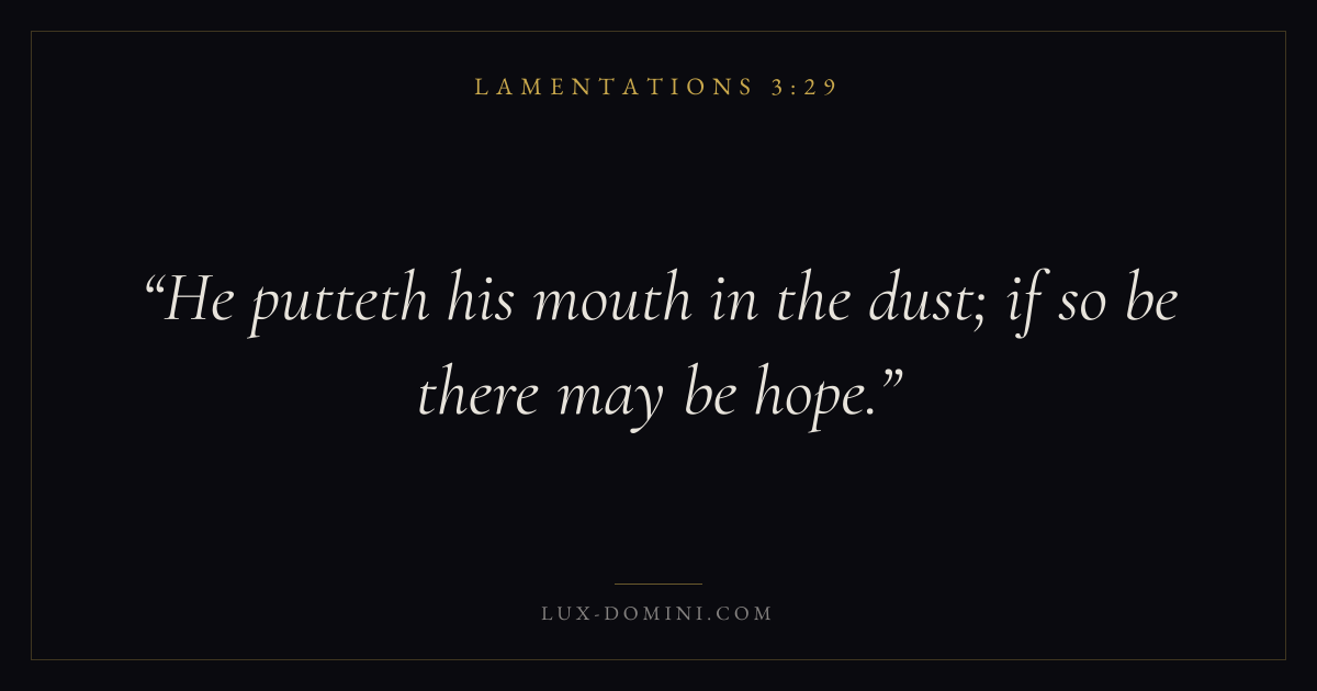 Books / Lamentations / Chapter 3 / Verse 29 ← Lamentations 3:28 Lamentations 3:29 Lamentations 3:30 → He putteth his mouth in the dust; if so be there may be hope. Download verse card Share on Twitter Share on Facebook Pin it ✦ Key themes HopeJustice and mercyLamentJudgment Read with Lamentations 3:28Romans 8:24Revelation 21:4Micah 6:8 Related topics Bible verses about hopeBible verses about justice and mercyBible verses about grief and loss ✦ Lamentations Chapter 3 verses V. 1 V. 2 V. 3 V. 4 V. 5 V. 6 V. 7 V. 8 V. 9 V. 10 V. 11 V. 12 V. 13 V. 14 V. 15 V. 16 V. 17 V. 18 V. 19 V. 20 V. 21 V. 22 V. 23 V. 24 V. 25 V. 26 V. 27 V. 28 V. 29 V. 30 V. 31 V. 32 V. 33 V. 34 V. 35 V. 36 V. 37 V. 38 V. 39 V. 40 V. 41 V. 42 V. 43 V. 44 V. 45 V. 46 V. 47 V. 48 V. 49 V. 50 V. 51 V. 52 V. 53 V. 54 V. 55 V. 56 V. 57 V. 58 V. 59 V. 60 V. 61 V. 62 V. 63 V. 64 V. 65 V. 66