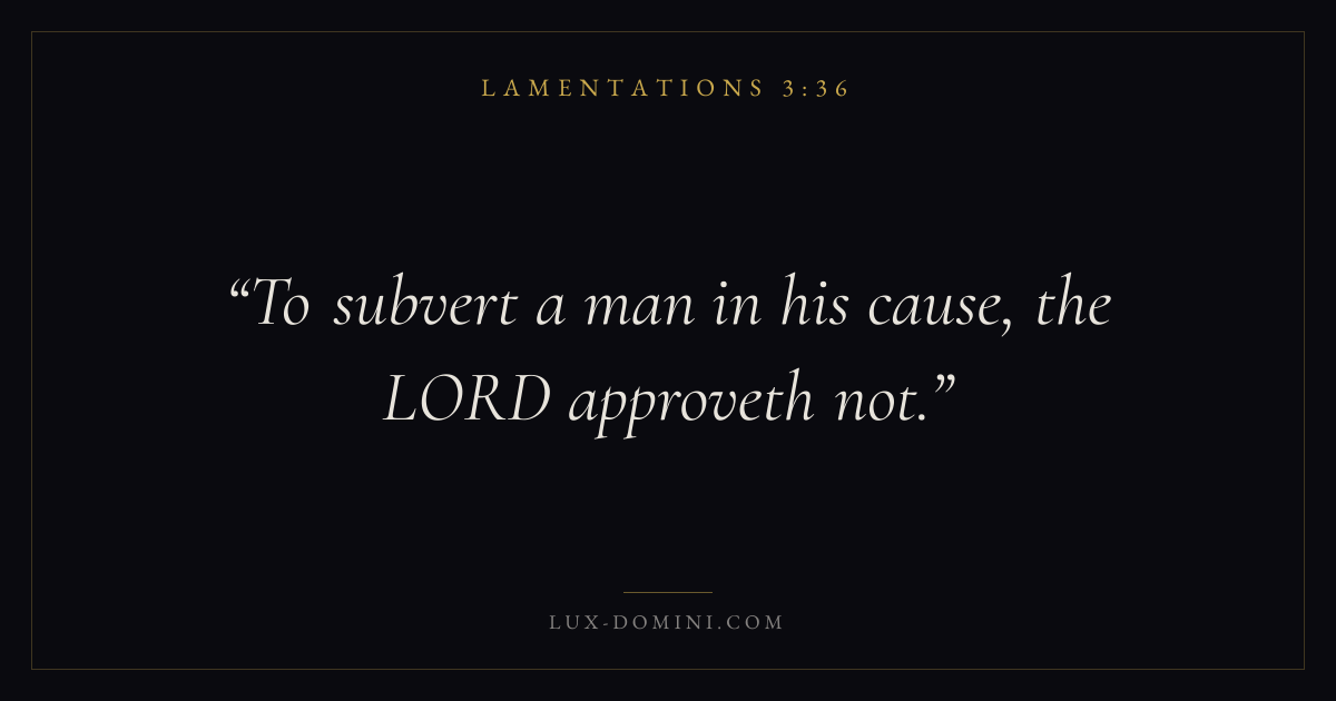 Books / Lamentations / Chapter 3 / Verse 36 ← Lamentations 3:35 Lamentations 3:36 Lamentations 3:37 → To subvert a man in his cause, the LORD approveth not. Download verse card Share on Twitter Share on Facebook Pin it ✦ Key themes HopeJustice and mercyLamentJudgment Read with Lamentations 3:34Lamentations 3:35Romans 8:24Revelation 21:4 Related topics Bible verses about hopeBible verses about justice and mercyBible verses about grief and loss ✦ Lamentations Chapter 3 verses V. 1 V. 2 V. 3 V. 4 V. 5 V. 6 V. 7 V. 8 V. 9 V. 10 V. 11 V. 12 V. 13 V. 14 V. 15 V. 16 V. 17 V. 18 V. 19 V. 20 V. 21 V. 22 V. 23 V. 24 V. 25 V. 26 V. 27 V. 28 V. 29 V. 30 V. 31 V. 32 V. 33 V. 34 V. 35 V. 36 V. 37 V. 38 V. 39 V. 40 V. 41 V. 42 V. 43 V. 44 V. 45 V. 46 V. 47 V. 48 V. 49 V. 50 V. 51 V. 52 V. 53 V. 54 V. 55 V. 56 V. 57 V. 58 V. 59 V. 60 V. 61 V. 62 V. 63 V. 64 V. 65 V. 66