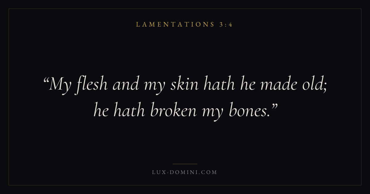 Books / Lamentations / Chapter 3 / Verse 4 ← Lamentations 3:3 Lamentations 3:4 Lamentations 3:5 → My flesh and my skin hath he made old; he hath broken my bones. Download verse card Share on Twitter Share on Facebook Pin it ✦ Key themes HopeSuffering and trialsJustice and mercyLament Read with Lamentations 3:3Romans 8:24Revelation 21:4Romans 8:18 Related topics Bible verses about hopeBible verses about suffering and trialsBible verses about justice and mercyBible verses about grief and loss ✦ Lamentations Chapter 3 verses V. 1 V. 2 V. 3 V. 4 V. 5 V. 6 V. 7 V. 8 V. 9 V. 10 V. 11 V. 12 V. 13 V. 14 V. 15 V. 16 V. 17 V. 18 V. 19 V. 20 V. 21 V. 22 V. 23 V. 24 V. 25 V. 26 V. 27 V. 28 V. 29 V. 30 V. 31 V. 32 V. 33 V. 34 V. 35 V. 36 V. 37 V. 38 V. 39 V. 40 V. 41 V. 42 V. 43 V. 44 V. 45 V. 46 V. 47 V. 48 V. 49 V. 50 V. 51 V. 52 V. 53 V. 54 V. 55 V. 56 V. 57 V. 58 V. 59 V. 60 V. 61 V. 62 V. 63 V. 64 V. 65 V. 66