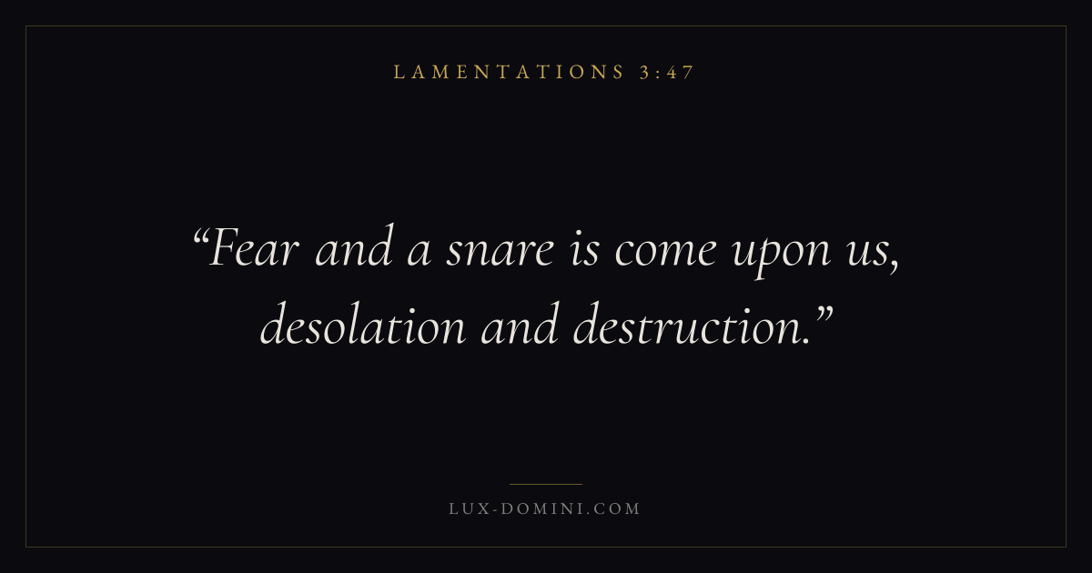Books / Lamentations / Chapter 3 / Verse 47 ← Lamentations 3:46 Lamentations 3:47 Lamentations 3:48 → Fear and a snare is come upon us, desolation and destruction. Download verse card Share on Twitter Share on Facebook Pin it ✦ Key themes HopeAnxiety and fearJustice and mercyTruthLament Read with Lamentations 3:46Lamentations 3:48Romans 8:24Revelation 21:4 Related topics Bible verses about hopeBible verses about anxiety and fearBible verses about justice and mercyBible verses about truthBible verses about grief and loss ✦ Lamentations Chapter 3 verses V. 1 V. 2 V. 3 V. 4 V. 5 V. 6 V. 7 V. 8 V. 9 V. 10 V. 11 V. 12 V. 13 V. 14 V. 15 V. 16 V. 17 V. 18 V. 19 V. 20 V. 21 V. 22 V. 23 V. 24 V. 25 V. 26 V. 27 V. 28 V. 29 V. 30 V. 31 V. 32 V. 33 V. 34 V. 35 V. 36 V. 37 V. 38 V. 39 V. 40 V. 41 V. 42 V. 43 V. 44 V. 45 V. 46 V. 47 V. 48 V. 49 V. 50 V. 51 V. 52 V. 53 V. 54 V. 55 V. 56 V. 57 V. 58 V. 59 V. 60 V. 61 V. 62 V. 63 V. 64 V. 65 V. 66