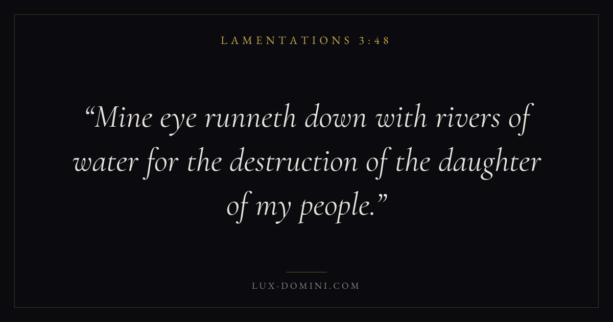 Books / Lamentations / Chapter 3 / Verse 48 ← Lamentations 3:47 Lamentations 3:48 Lamentations 3:49 → Mine eye runneth down with rivers of water for the destruction of the daughter of my people. Download verse card Share on Twitter Share on Facebook Pin it ✦ Key themes HopeJustice and mercyTruthLament Read with Lamentations 3:46Lamentations 3:47Romans 8:24Revelation 21:4 Related topics Bible verses about hopeBible verses about justice and mercyBible verses about truthBible verses about grief and loss ✦ Lamentations Chapter 3 verses V. 1 V. 2 V. 3 V. 4 V. 5 V. 6 V. 7 V. 8 V. 9 V. 10 V. 11 V. 12 V. 13 V. 14 V. 15 V. 16 V. 17 V. 18 V. 19 V. 20 V. 21 V. 22 V. 23 V. 24 V. 25 V. 26 V. 27 V. 28 V. 29 V. 30 V. 31 V. 32 V. 33 V. 34 V. 35 V. 36 V. 37 V. 38 V. 39 V. 40 V. 41 V. 42 V. 43 V. 44 V. 45 V. 46 V. 47 V. 48 V. 49 V. 50 V. 51 V. 52 V. 53 V. 54 V. 55 V. 56 V. 57 V. 58 V. 59 V. 60 V. 61 V. 62 V. 63 V. 64 V. 65 V. 66