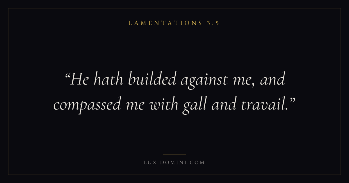 Books / Lamentations / Chapter 3 / Verse 5 ← Lamentations 3:4 Lamentations 3:5 Lamentations 3:6 → He hath builded against me, and compassed me with gall and travail. Download verse card Share on Twitter Share on Facebook Pin it ✦ Key themes HopeSuffering and trialsJustice and mercyLament Read with Lamentations 3:6Romans 8:24Revelation 21:4Romans 8:18 Related topics Bible verses about hopeBible verses about suffering and trialsBible verses about justice and mercyBible verses about grief and loss ✦ Lamentations Chapter 3 verses V. 1 V. 2 V. 3 V. 4 V. 5 V. 6 V. 7 V. 8 V. 9 V. 10 V. 11 V. 12 V. 13 V. 14 V. 15 V. 16 V. 17 V. 18 V. 19 V. 20 V. 21 V. 22 V. 23 V. 24 V. 25 V. 26 V. 27 V. 28 V. 29 V. 30 V. 31 V. 32 V. 33 V. 34 V. 35 V. 36 V. 37 V. 38 V. 39 V. 40 V. 41 V. 42 V. 43 V. 44 V. 45 V. 46 V. 47 V. 48 V. 49 V. 50 V. 51 V. 52 V. 53 V. 54 V. 55 V. 56 V. 57 V. 58 V. 59 V. 60 V. 61 V. 62 V. 63 V. 64 V. 65 V. 66