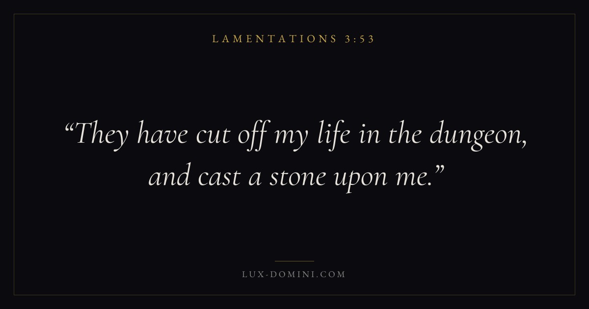 Books / Lamentations / Chapter 3 / Verse 53 ← Lamentations 3:52 Lamentations 3:53 Lamentations 3:54 → They have cut off my life in the dungeon, and cast a stone upon me. Download verse card Share on Twitter Share on Facebook Pin it ✦ Key themes HopeJustice and mercyTruthLament Read with Lamentations 3:54Romans 8:24Revelation 21:4Micah 6:8 Related topics Bible verses about hopeBible verses about justice and mercyBible verses about truthBible verses about grief and loss ✦ Lamentations Chapter 3 verses V. 1 V. 2 V. 3 V. 4 V. 5 V. 6 V. 7 V. 8 V. 9 V. 10 V. 11 V. 12 V. 13 V. 14 V. 15 V. 16 V. 17 V. 18 V. 19 V. 20 V. 21 V. 22 V. 23 V. 24 V. 25 V. 26 V. 27 V. 28 V. 29 V. 30 V. 31 V. 32 V. 33 V. 34 V. 35 V. 36 V. 37 V. 38 V. 39 V. 40 V. 41 V. 42 V. 43 V. 44 V. 45 V. 46 V. 47 V. 48 V. 49 V. 50 V. 51 V. 52 V. 53 V. 54 V. 55 V. 56 V. 57 V. 58 V. 59 V. 60 V. 61 V. 62 V. 63 V. 64 V. 65 V. 66