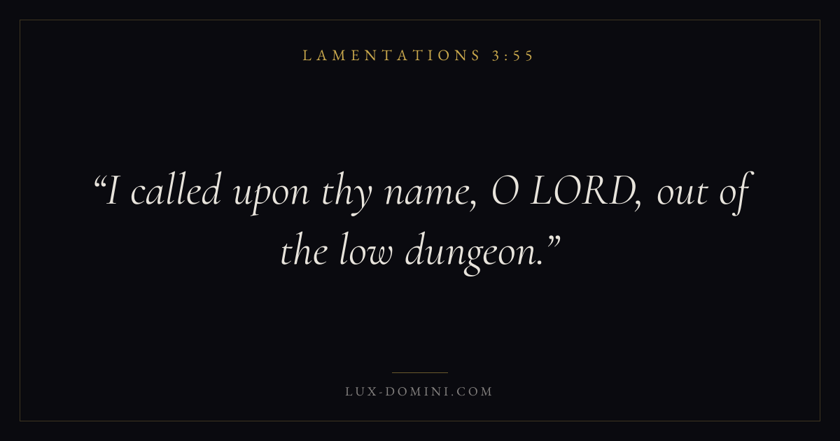 Books / Lamentations / Chapter 3 / Verse 55 ← Lamentations 3:54 Lamentations 3:55 Lamentations 3:56 → I called upon thy name, O LORD, out of the low dungeon. Download verse card Share on Twitter Share on Facebook Pin it ✦ Key themes FaithHopePrayerJustice and mercyLament Read with Lamentations 3:56Hebrews 11:1Romans 10:17Romans 8:24 Related topics Bible verses about faithBible verses about hopeBible verses about prayerBible verses about justice and mercyBible verses about grief and loss ✦ Lamentations Chapter 3 verses V. 1 V. 2 V. 3 V. 4 V. 5 V. 6 V. 7 V. 8 V. 9 V. 10 V. 11 V. 12 V. 13 V. 14 V. 15 V. 16 V. 17 V. 18 V. 19 V. 20 V. 21 V. 22 V. 23 V. 24 V. 25 V. 26 V. 27 V. 28 V. 29 V. 30 V. 31 V. 32 V. 33 V. 34 V. 35 V. 36 V. 37 V. 38 V. 39 V. 40 V. 41 V. 42 V. 43 V. 44 V. 45 V. 46 V. 47 V. 48 V. 49 V. 50 V. 51 V. 52 V. 53 V. 54 V. 55 V. 56 V. 57 V. 58 V. 59 V. 60 V. 61 V. 62 V. 63 V. 64 V. 65 V. 66