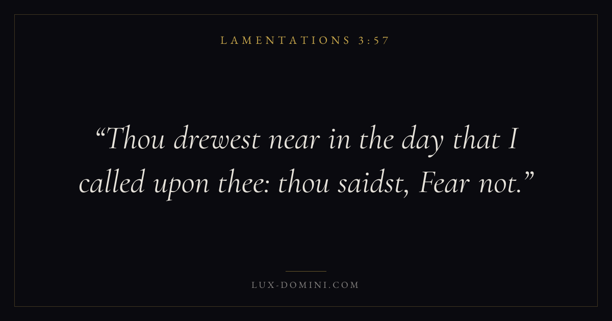 Books / Lamentations / Chapter 3 / Verse 57 ← Lamentations 3:56 Lamentations 3:57 Lamentations 3:58 → Thou drewest near in the day that I called upon thee: thou saidst, Fear not. Download verse card Share on Twitter Share on Facebook Pin it ✦ Key themes FaithHopeAnxiety and fearPrayerLament Read with Lamentations 3:58Hebrews 11:1Romans 10:17Romans 8:24 Related topics Bible verses about faithBible verses about hopeBible verses about anxiety and fearBible verses about prayerBible verses about grief and loss ✦ Lamentations Chapter 3 verses V. 1 V. 2 V. 3 V. 4 V. 5 V. 6 V. 7 V. 8 V. 9 V. 10 V. 11 V. 12 V. 13 V. 14 V. 15 V. 16 V. 17 V. 18 V. 19 V. 20 V. 21 V. 22 V. 23 V. 24 V. 25 V. 26 V. 27 V. 28 V. 29 V. 30 V. 31 V. 32 V. 33 V. 34 V. 35 V. 36 V. 37 V. 38 V. 39 V. 40 V. 41 V. 42 V. 43 V. 44 V. 45 V. 46 V. 47 V. 48 V. 49 V. 50 V. 51 V. 52 V. 53 V. 54 V. 55 V. 56 V. 57 V. 58 V. 59 V. 60 V. 61 V. 62 V. 63 V. 64 V. 65 V. 66