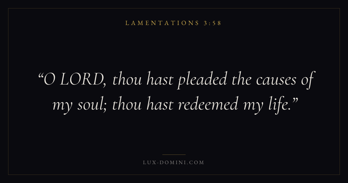 Books / Lamentations / Chapter 3 / Verse 58 ← Lamentations 3:57 Lamentations 3:58 Lamentations 3:59 → O LORD, thou hast pleaded the causes of my soul; thou hast redeemed my life. Download verse card Share on Twitter Share on Facebook Pin it ✦ Key themes FaithHopePrayerJustice and mercyLament Read with Lamentations 3:57Hebrews 11:1Romans 10:17Romans 8:24 Related topics Bible verses about faithBible verses about hopeBible verses about prayerBible verses about justice and mercyBible verses about grief and loss ✦ Lamentations Chapter 3 verses V. 1 V. 2 V. 3 V. 4 V. 5 V. 6 V. 7 V. 8 V. 9 V. 10 V. 11 V. 12 V. 13 V. 14 V. 15 V. 16 V. 17 V. 18 V. 19 V. 20 V. 21 V. 22 V. 23 V. 24 V. 25 V. 26 V. 27 V. 28 V. 29 V. 30 V. 31 V. 32 V. 33 V. 34 V. 35 V. 36 V. 37 V. 38 V. 39 V. 40 V. 41 V. 42 V. 43 V. 44 V. 45 V. 46 V. 47 V. 48 V. 49 V. 50 V. 51 V. 52 V. 53 V. 54 V. 55 V. 56 V. 57 V. 58 V. 59 V. 60 V. 61 V. 62 V. 63 V. 64 V. 65 V. 66