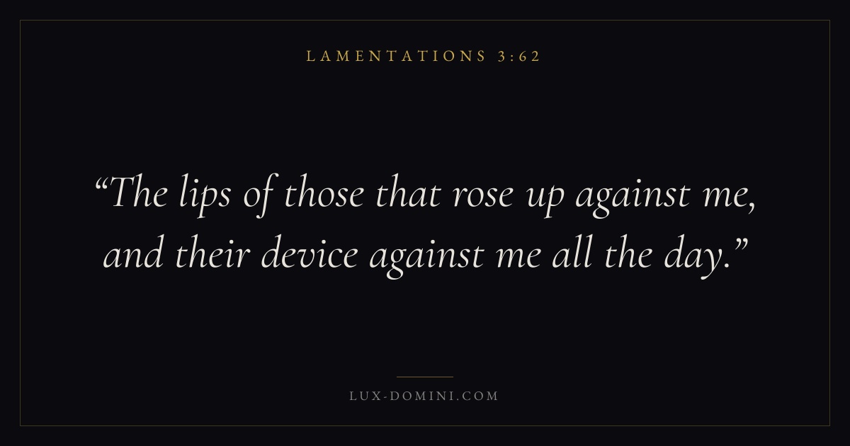 Books / Lamentations / Chapter 3 / Verse 62 ← Lamentations 3:61 Lamentations 3:62 Lamentations 3:63 → The lips of those that rose up against me, and their device against me all the day. Download verse card Share on Twitter Share on Facebook Pin it ✦ Key themes FaithHopePrayerJustice and mercyLament Read with Lamentations 3:61Lamentations 3:63Hebrews 11:1Romans 10:17 Related topics Bible verses about faithBible verses about hopeBible verses about prayerBible verses about justice and mercyBible verses about grief and loss ✦ Lamentations Chapter 3 verses V. 1 V. 2 V. 3 V. 4 V. 5 V. 6 V. 7 V. 8 V. 9 V. 10 V. 11 V. 12 V. 13 V. 14 V. 15 V. 16 V. 17 V. 18 V. 19 V. 20 V. 21 V. 22 V. 23 V. 24 V. 25 V. 26 V. 27 V. 28 V. 29 V. 30 V. 31 V. 32 V. 33 V. 34 V. 35 V. 36 V. 37 V. 38 V. 39 V. 40 V. 41 V. 42 V. 43 V. 44 V. 45 V. 46 V. 47 V. 48 V. 49 V. 50 V. 51 V. 52 V. 53 V. 54 V. 55 V. 56 V. 57 V. 58 V. 59 V. 60 V. 61 V. 62 V. 63 V. 64 V. 65 V. 66