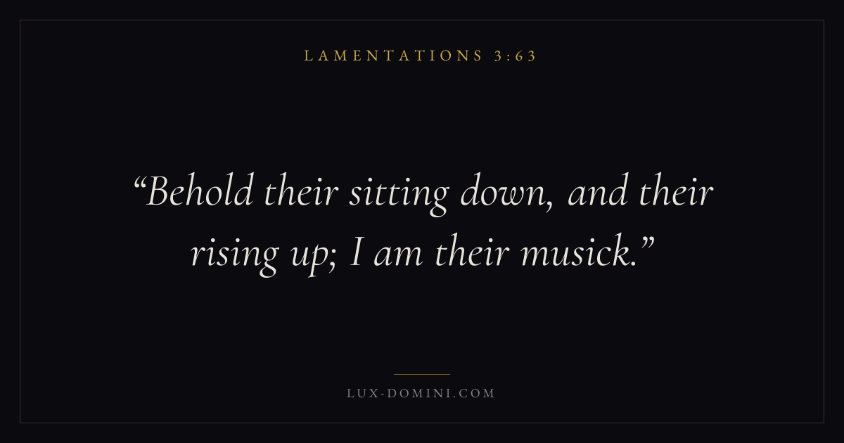Books / Lamentations / Chapter 3 / Verse 63 ← Lamentations 3:62 Lamentations 3:63 Lamentations 3:64 → Behold their sitting down, and their rising up; I am their musick. Download verse card Share on Twitter Share on Facebook Pin it ✦ Key themes FaithHopePrayerJustice and mercyLament Read with Lamentations 3:61Lamentations 3:62Hebrews 11:1Romans 10:17 Related topics Bible verses about faithBible verses about hopeBible verses about prayerBible verses about justice and mercyBible verses about grief and loss ✦ Lamentations Chapter 3 verses V. 1 V. 2 V. 3 V. 4 V. 5 V. 6 V. 7 V. 8 V. 9 V. 10 V. 11 V. 12 V. 13 V. 14 V. 15 V. 16 V. 17 V. 18 V. 19 V. 20 V. 21 V. 22 V. 23 V. 24 V. 25 V. 26 V. 27 V. 28 V. 29 V. 30 V. 31 V. 32 V. 33 V. 34 V. 35 V. 36 V. 37 V. 38 V. 39 V. 40 V. 41 V. 42 V. 43 V. 44 V. 45 V. 46 V. 47 V. 48 V. 49 V. 50 V. 51 V. 52 V. 53 V. 54 V. 55 V. 56 V. 57 V. 58 V. 59 V. 60 V. 61 V. 62 V. 63 V. 64 V. 65 V. 66