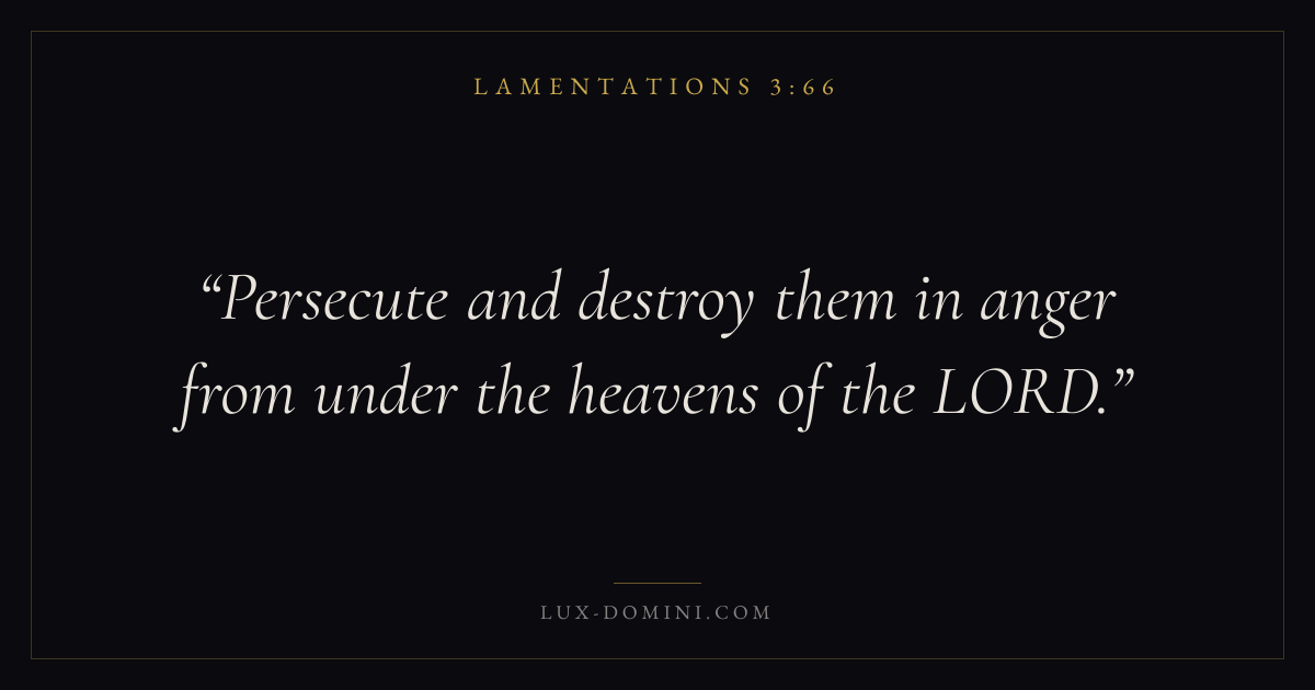Books / Lamentations / Chapter 3 / Verse 66 ← Lamentations 3:65 Lamentations 3:66 Lamentations 4:1 → Persecute and destroy them in anger from under the heavens of the LORD. Download verse card Share on Twitter Share on Facebook Pin it ✦ Key themes FaithHopePrayerJustice and mercyLament Read with Lamentations 3:64Lamentations 3:65Hebrews 11:1Romans 10:17 Related topics Bible verses about faithBible verses about hopeBible verses about prayerBible verses about justice and mercyBible verses about grief and loss ✦ Lamentations Chapter 3 verses V. 1 V. 2 V. 3 V. 4 V. 5 V. 6 V. 7 V. 8 V. 9 V. 10 V. 11 V. 12 V. 13 V. 14 V. 15 V. 16 V. 17 V. 18 V. 19 V. 20 V. 21 V. 22 V. 23 V. 24 V. 25 V. 26 V. 27 V. 28 V. 29 V. 30 V. 31 V. 32 V. 33 V. 34 V. 35 V. 36 V. 37 V. 38 V. 39 V. 40 V. 41 V. 42 V. 43 V. 44 V. 45 V. 46 V. 47 V. 48 V. 49 V. 50 V. 51 V. 52 V. 53 V. 54 V. 55 V. 56 V. 57 V. 58 V. 59 V. 60 V. 61 V. 62 V. 63 V. 64 V. 65 V. 66