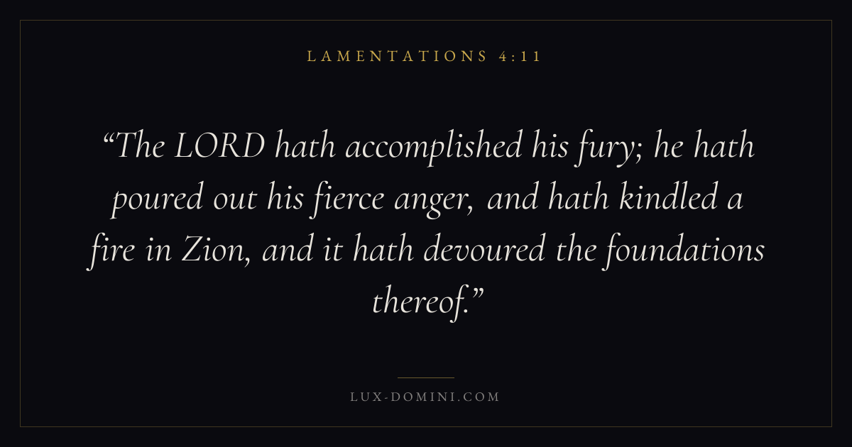 The LORD hath accomplished his fury; he hath poured out his fierce anger, and hath kindled a fire in Zion, and it hath devoured the foundations thereof.