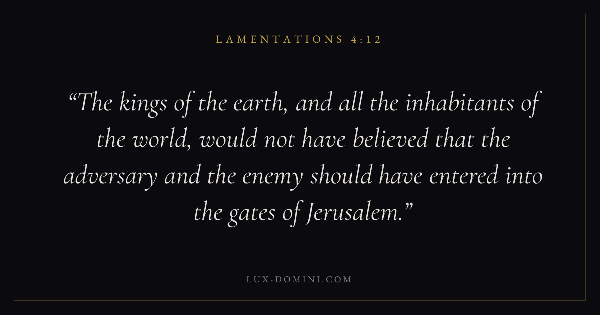 The kings of the earth, and all the inhabitants of the world, would not have believed that the adversary and the enemy should have entered into the gates of Jerusalem.