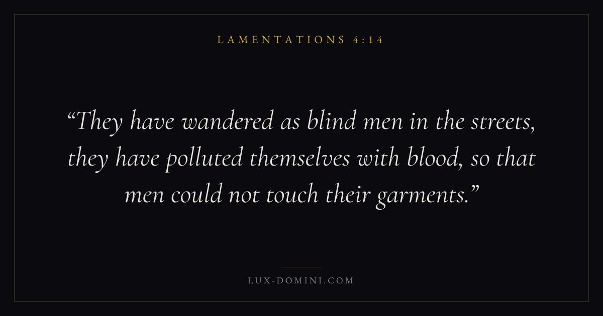 They have wandered as blind men in the streets, they have polluted themselves with blood, so that men could not touch their garments.