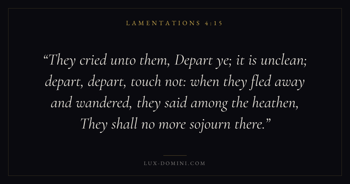 They cried unto them, Depart ye; it is unclean; depart, depart, touch not: when they fled away and wandered, they said among the heathen, They shall no more sojourn there.