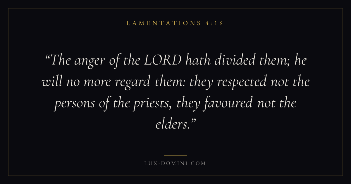 The anger of the LORD hath divided them; he will no more regard them: they respected not the persons of the priests, they favoured not the elders.