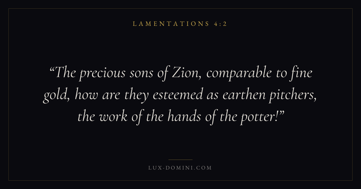 The precious sons of Zion, comparable to fine gold, how are they esteemed as earthen pitchers, the work of the hands of the potter!