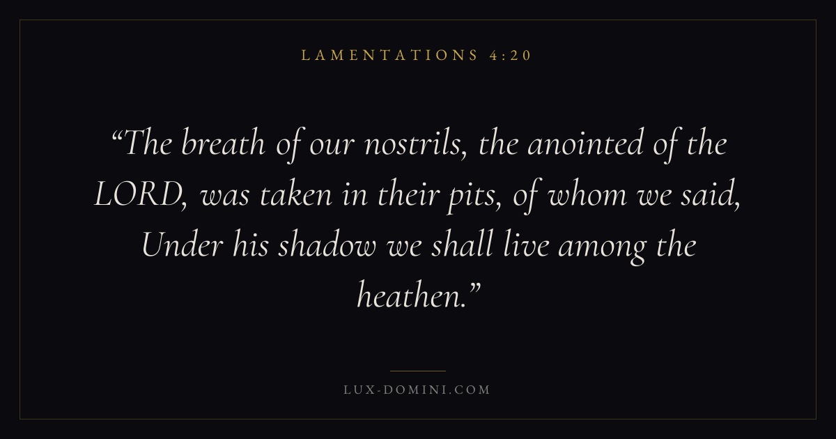 The breath of our nostrils, the anointed of the LORD, was taken in their pits, of whom we said, Under his shadow we shall live among the heathen.