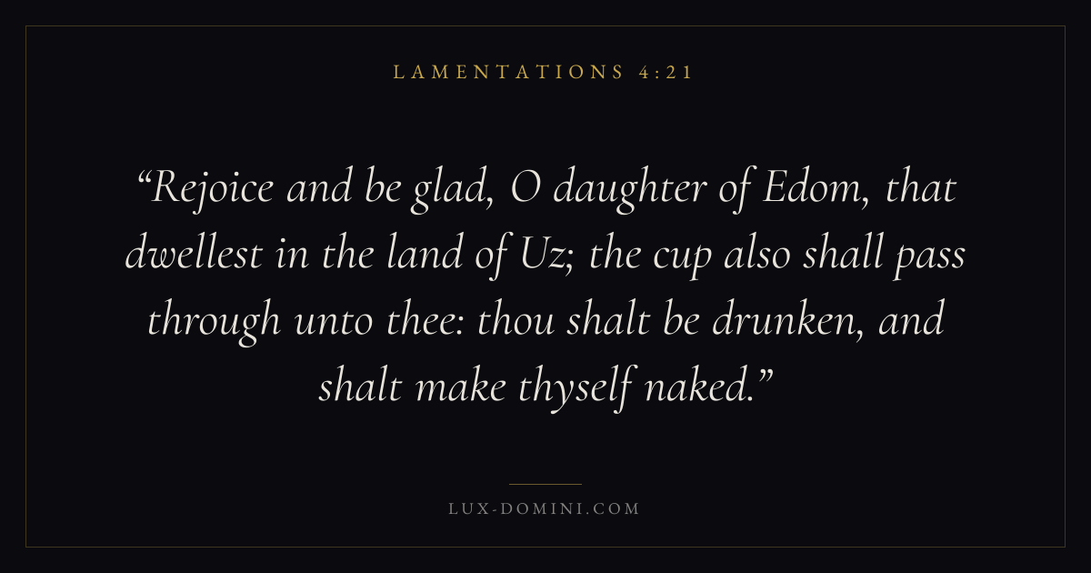 Rejoice and be glad, O daughter of Edom, that dwellest in the land of Uz; the cup also shall pass through unto thee: thou shalt be drunken, and shalt make thyself naked.