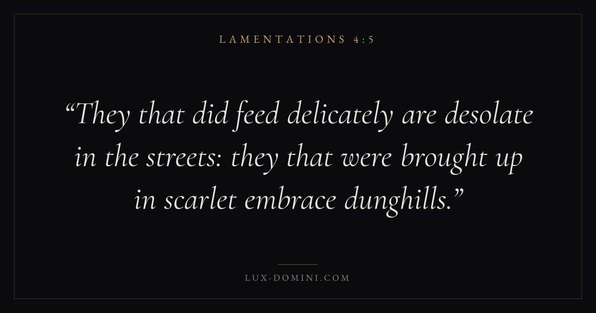 They that did feed delicately are desolate in the streets: they that were brought up in scarlet embrace dunghills.