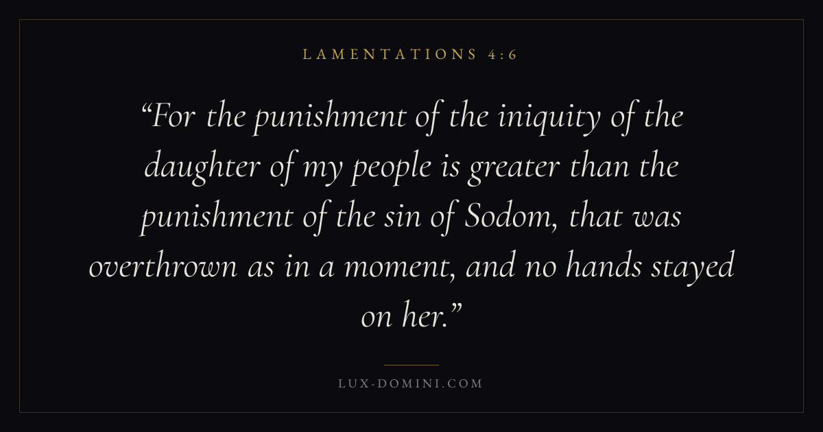 For the punishment of the iniquity of the daughter of my people is greater than the punishment of the sin of Sodom, that was overthrown as in a moment, and no hands stayed on her.