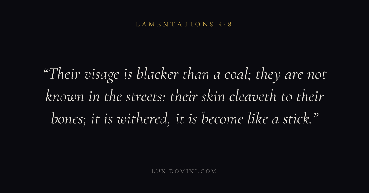 Their visage is blacker than a coal; they are not known in the streets: their skin cleaveth to their bones; it is withered, it is become like a stick.