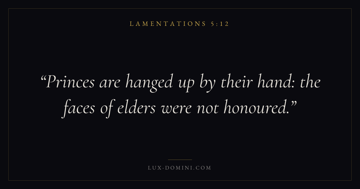 Books / Lamentations / Chapter 5 / Verse 12 ← Lamentations 5:11 Lamentations 5:12 Lamentations 5:13 → Princes are hanged up by their hand: the faces of elders were not honoured. Download verse card Share on Twitter Share on Facebook Pin it ✦ Key themes HopeSuffering and trialsPrayerJustice and mercyLament Read with Lamentations 5:11Romans 8:24Revelation 21:4Romans 8:18 Related topics Bible verses about hopeBible verses about suffering and trialsBible verses about prayerBible verses about justice and mercyBible verses about grief and loss ✦ Lamentations Chapter 5 verses V. 1 V. 2 V. 3 V. 4 V. 5 V. 6 V. 7 V. 8 V. 9 V. 10 V. 11 V. 12 V. 13 V. 14 V. 15 V. 16 V. 17 V. 18 V. 19 V. 20 V. 21 V. 22