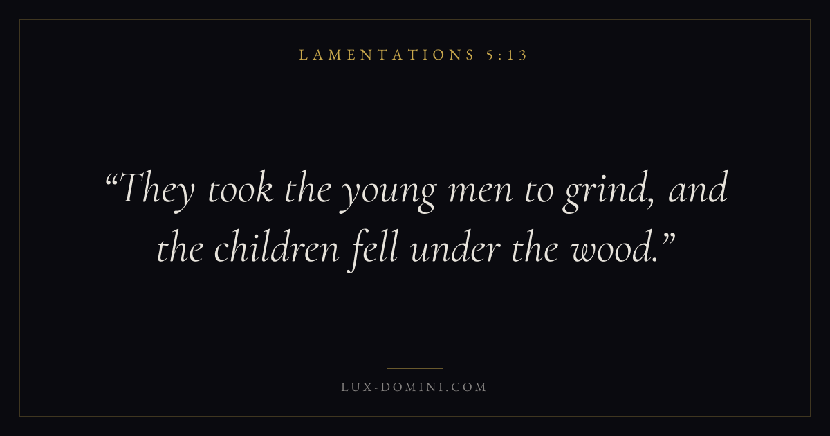 Books / Lamentations / Chapter 5 / Verse 13 ← Lamentations 5:12 Lamentations 5:13 Lamentations 5:14 → They took the young men to grind, and the children fell under the wood. Download verse card Share on Twitter Share on Facebook Pin it ✦ Key themes HopeSuffering and trialsPrayerJustice and mercyLament Read with Lamentations 5:14Romans 8:24Revelation 21:4Romans 8:18 Related topics Bible verses about hopeBible verses about suffering and trialsBible verses about prayerBible verses about justice and mercyBible verses about grief and loss ✦ Lamentations Chapter 5 verses V. 1 V. 2 V. 3 V. 4 V. 5 V. 6 V. 7 V. 8 V. 9 V. 10 V. 11 V. 12 V. 13 V. 14 V. 15 V. 16 V. 17 V. 18 V. 19 V. 20 V. 21 V. 22