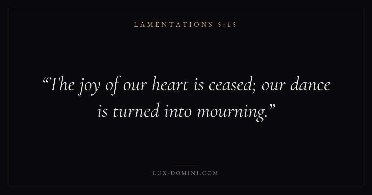 Books / Lamentations / Chapter 5 / Verse 15 ← Lamentations 5:14 Lamentations 5:15 Lamentations 5:16 → The joy of our heart is ceased; our dance is turned into mourning. Download verse card Share on Twitter Share on Facebook Pin it ✦ Key themes HopeSuffering and trialsPrayerJustice and mercyLament Read with Lamentations 5:16Romans 8:24Revelation 21:4Romans 8:18 Related topics Bible verses about hopeBible verses about suffering and trialsBible verses about prayerBible verses about justice and mercyBible verses about grief and loss ✦ Lamentations Chapter 5 verses V. 1 V. 2 V. 3 V. 4 V. 5 V. 6 V. 7 V. 8 V. 9 V. 10 V. 11 V. 12 V. 13 V. 14 V. 15 V. 16 V. 17 V. 18 V. 19 V. 20 V. 21 V. 22