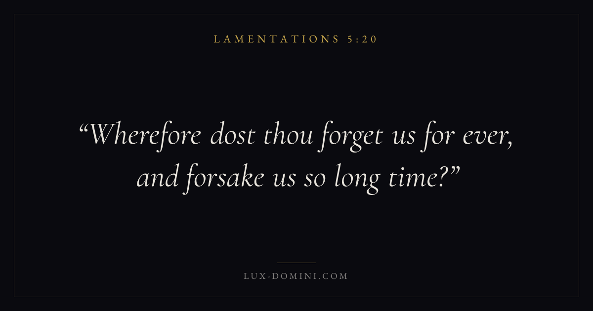 Books / Lamentations / Chapter 5 / Verse 20 ← Lamentations 5:19 Lamentations 5:20 Lamentations 5:21 → Wherefore dost thou forget us for ever, and forsake us so long time? Download verse card Share on Twitter Share on Facebook Pin it ✦ Key themes HopeWisdomJustice and mercyPeaceLament Read with Lamentations 5:19Romans 8:24Revelation 21:4Proverbs 1:7 Related topics Bible verses about hopeBible verses about wisdomBible verses about justice and mercyBible verses about peaceBible verses about grief and loss ✦ Lamentations Chapter 5 verses V. 1 V. 2 V. 3 V. 4 V. 5 V. 6 V. 7 V. 8 V. 9 V. 10 V. 11 V. 12 V. 13 V. 14 V. 15 V. 16 V. 17 V. 18 V. 19 V. 20 V. 21 V. 22