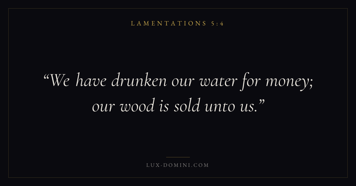 Books / Lamentations / Chapter 5 / Verse 4 ← Lamentations 5:3 Lamentations 5:4 Lamentations 5:5 → We have drunken our water for money; our wood is sold unto us. Download verse card Share on Twitter Share on Facebook Pin it ✦ Key themes HopeSuffering and trialsPrayerJustice and mercyLament Read with Lamentations 5:3Romans 8:24Revelation 21:4Romans 8:18 Related topics Bible verses about hopeBible verses about suffering and trialsBible verses about prayerBible verses about justice and mercyBible verses about grief and loss ✦ Lamentations Chapter 5 verses V. 1 V. 2 V. 3 V. 4 V. 5 V. 6 V. 7 V. 8 V. 9 V. 10 V. 11 V. 12 V. 13 V. 14 V. 15 V. 16 V. 17 V. 18 V. 19 V. 20 V. 21 V. 22