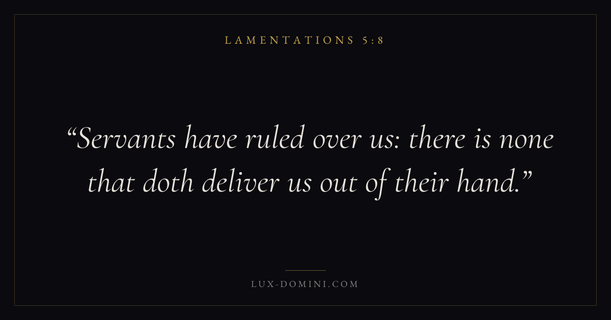 Books / Lamentations / Chapter 5 / Verse 8 ← Lamentations 5:7 Lamentations 5:8 Lamentations 5:9 → Servants have ruled over us: there is none that doth deliver us out of their hand. Download verse card Share on Twitter Share on Facebook Pin it ✦ Key themes HopeSuffering and trialsPrayerJustice and mercyLament Read with Lamentations 5:7Romans 8:24Revelation 21:4Romans 8:18 Related topics Bible verses about hopeBible verses about suffering and trialsBible verses about prayerBible verses about justice and mercyBible verses about grief and loss ✦ Lamentations Chapter 5 verses V. 1 V. 2 V. 3 V. 4 V. 5 V. 6 V. 7 V. 8 V. 9 V. 10 V. 11 V. 12 V. 13 V. 14 V. 15 V. 16 V. 17 V. 18 V. 19 V. 20 V. 21 V. 22