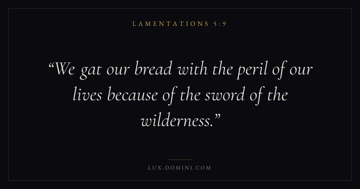 Books / Lamentations / Chapter 5 / Verse 9 ← Lamentations 5:8 Lamentations 5:9 Lamentations 5:10 → We gat our bread with the peril of our lives because of the sword of the wilderness. Download verse card Share on Twitter Share on Facebook Pin it ✦ Key themes HopeSuffering and trialsPrayerJustice and mercyLament Read with Lamentations 5:10Romans 8:24Revelation 21:4Romans 8:18 Related topics Bible verses about hopeBible verses about suffering and trialsBible verses about prayerBible verses about justice and mercyBible verses about grief and loss ✦ Lamentations Chapter 5 verses V. 1 V. 2 V. 3 V. 4 V. 5 V. 6 V. 7 V. 8 V. 9 V. 10 V. 11 V. 12 V. 13 V. 14 V. 15 V. 16 V. 17 V. 18 V. 19 V. 20 V. 21 V. 22