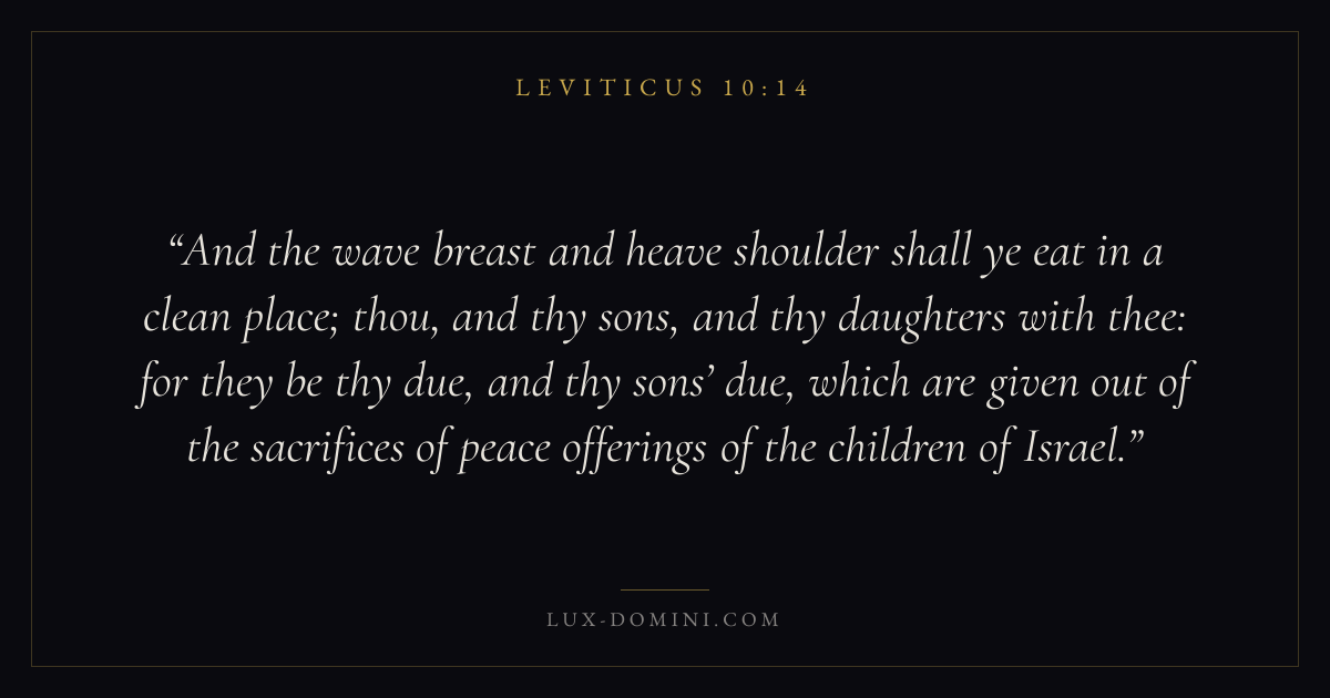 And the wave breast and heave shoulder shall ye eat in a clean place; thou, and thy sons, and thy daughters with thee: for they be thy due, and thy sons’ due, which are given out of the sacrifices of peace offerings of the children of Israel.