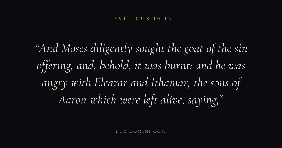 And Moses diligently sought the goat of the sin offering, and, behold, it was burnt: and he was angry with Eleazar and Ithamar, the sons of Aaron which were left alive, saying,